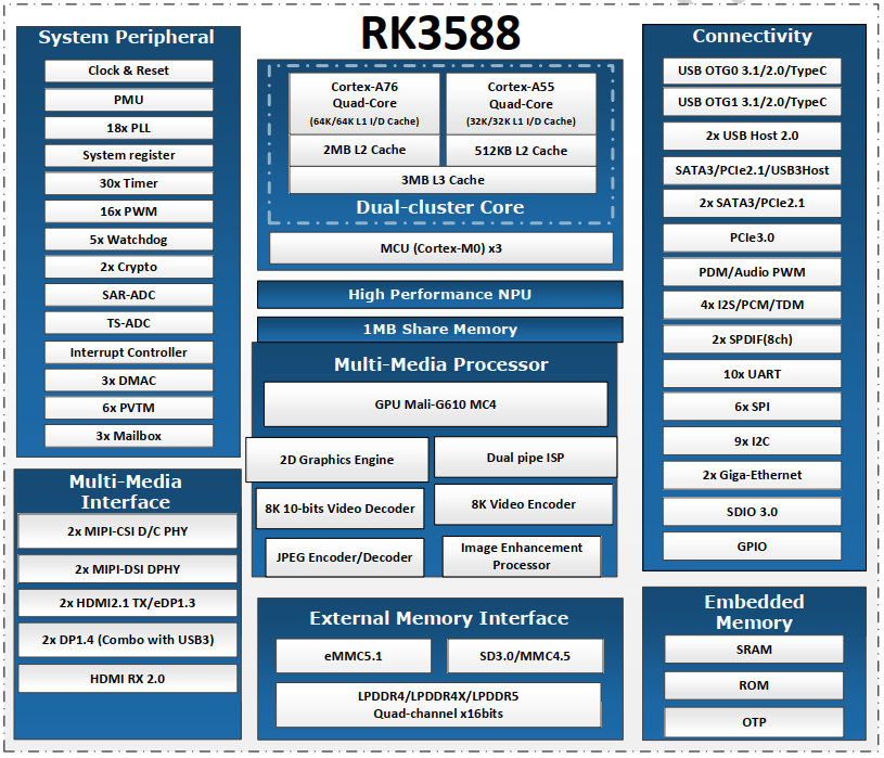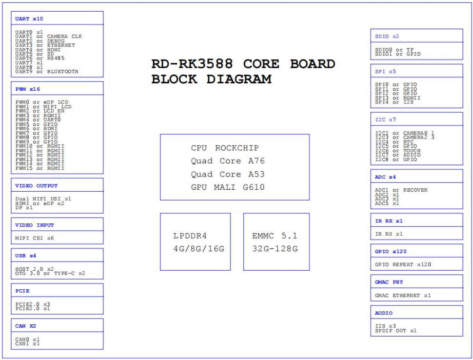 核心板采用ROCKCHIP 八核RK3588 四核A76+四核A55 四核处理器,搭载Android/Linux+QT/Ubuntu 系 统 ,A76主频2.4GHz , A55主频1.8G,采用Mali-G610 MP4 GPU,内置 6T 算力 NPU,最大支持16G内存。支持H.265和VP9@60帧视频解码、H.264 @ 30帧视频解码等;支持多路市场通用显示屏接口,支持多屏异显,核心板接口丰富,引出全部功能引脚,支持多款外设扩展,是您在人机交互、工控项目上的最佳选择。