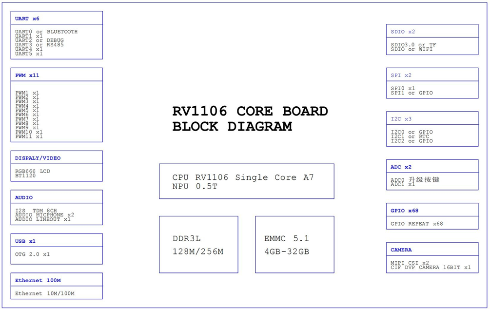 RV1106 采用瑞芯微 Cortex-A7 单核处理器+MCU+0.5TOPS 算力NPU,搭载Linux 系统,超低功耗,核心板接口丰富,引出全部功能引脚,邮票孔焊接更牢靠,出厂默认标配屏蔽罩,支持多款外设扩展,是人脸识及图像处理项目上的最佳选择。